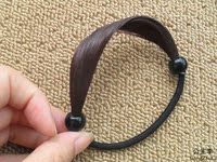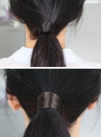 温馨提示:不要像平时用皮筋一样用力套上去,这是不正确的。一定要先用黑色皮筋扎好头发再把假发圈套上去,因为假发发圈毕竟是把无数根假发粘在一起塞在小帽里固定做成的发圈,要按大家平时扎头发的力度是承受不了多少次的,所以先用皮筋扎好再套这个挽几圈用多少次都不会松开的