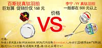这个是我们5月赚人气只为赚人气,低于成本大特卖,很多人可能会问我们你们这么可能低于成本销售呢?那我们来看看你就知道我们说的是不是实话,你可以看看真的钛科技球拍并且可以拉线到30磅并采用日本进口高精度的碳纤维的球拍有低于300元一支的的吗?而像李宁,YY这类正品的能达到这个标准的价格都是500元以上大家可以在比较就知道