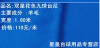此款台尼更耐用、厚度大、不易掉毛、无球砸白点现象,适合中高档台球室使用(刚开始一周内有轻微掉毛现象属于正常,望各亲们不要误会,使用周期至少12个月,2面都可以使用的,不起白点的哦)