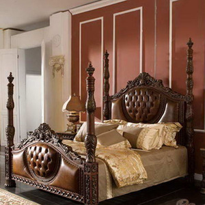 精雕刻/美式系列/实木家具/欧式家具/ 高柱真皮床