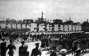1957年国庆节时,举着“把反右派斗争进行到底”巨幅标语的游行队伍。