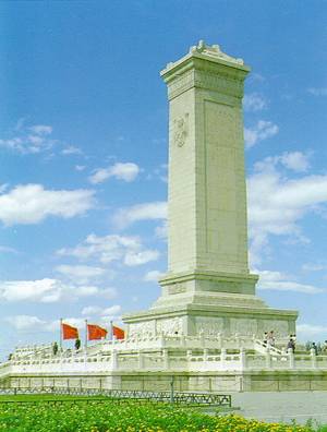 人民英雄纪念碑,是用一万七千块花岗石和汉白玉石建成的,碑基占地三千多平方公尺,碑身高达三十七点九四公尺,是我国最大的纪念碑。